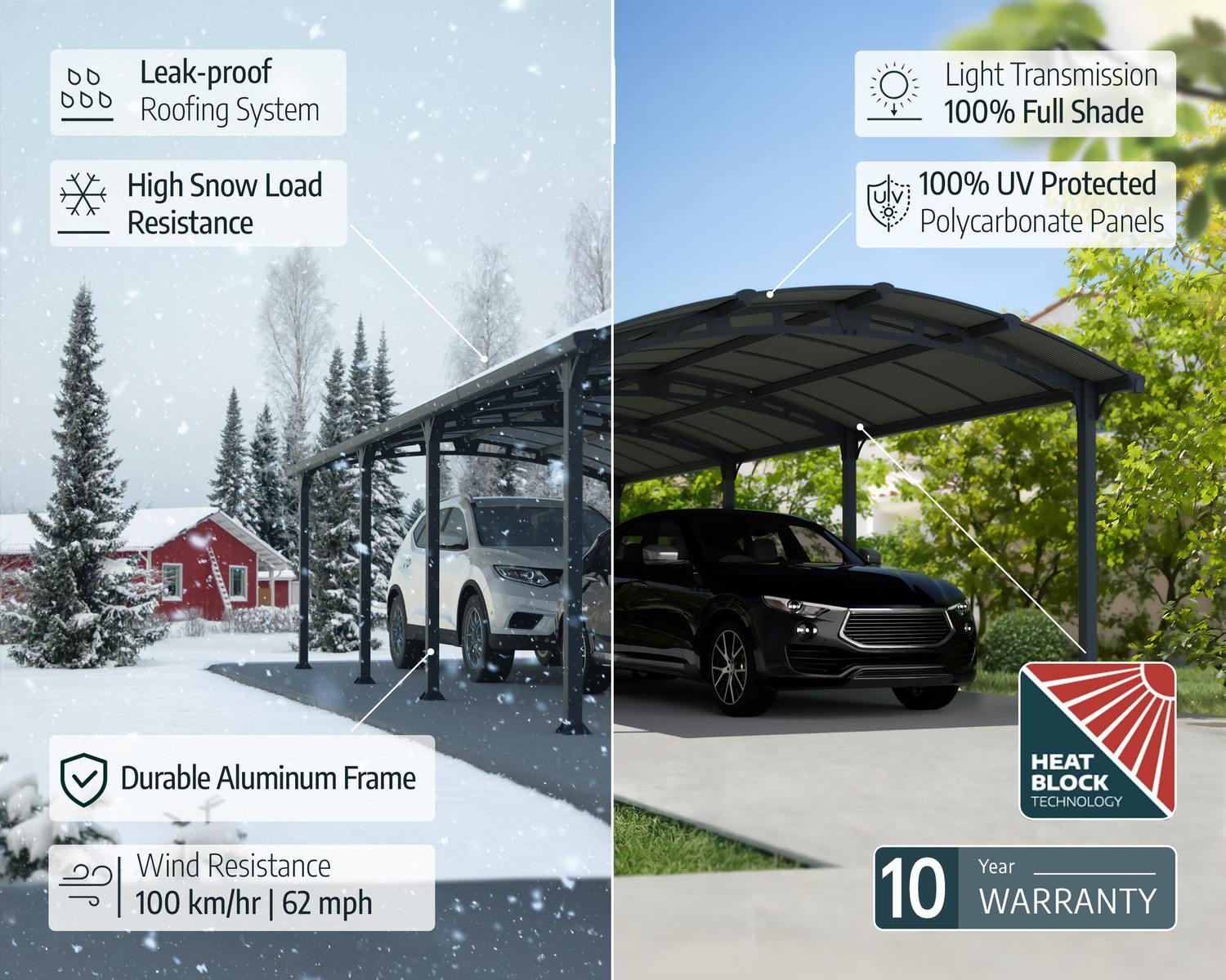 We’ve all had those mornings when the weather is awful, and you have to clear the snow off your car or get into a scorching hot vehicle. The Arcadia Carport saves you time and effort and shields you and your car from the weather. The curved roof Carport also protects your car from colour fading from the sun, unnecessary scratches, and damage. With over 10 feet of entry width and 7 feet of overhead clearance, the Arcadia single carport gives you plenty of room to park and walk around your vehicle. This sturdy single carport also boasts a snow load capacity of up to 15.4 lbs./ft². Other features include a gutter to direct rainwater, high impact twin-wall polycarbonate roof panels and an aluminium rust-resistant frame. All these features mean that the structure is multipurpose and can be used as a covered outdoor lounging area as well. Extend the life of your vehicle and spend less time worrying about your car with the Arcadia Carport Kit.